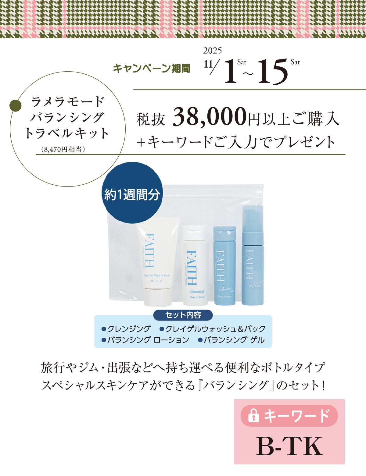 - 特典内容:旅行やジム・出張などへ持ち運べる便利なボトルタイプ スペシャルスキンケアができる「バランシング」のセット! 約1週間分