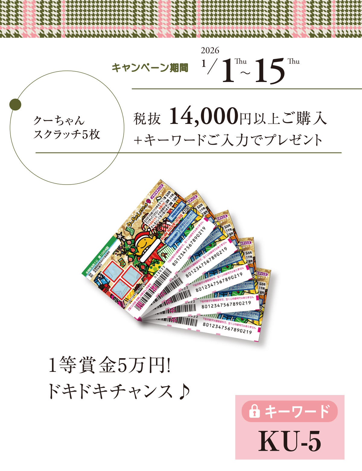 • 特典内容:クーちゃんスクラッチ5枚 1等賞金5万円!ドキドキチャンス♪