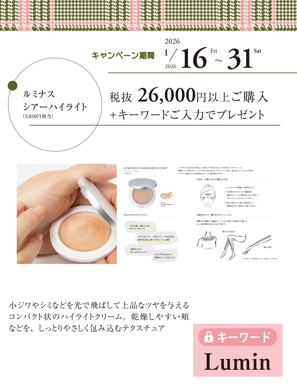 - 特典内容:小ジワやシミなどを光で飛ばして上品なツヤを与えるコンパクト状のハイライトクリーム。乾燥しやすい頬などを、しっとりやさしく包み込むテクスチュア