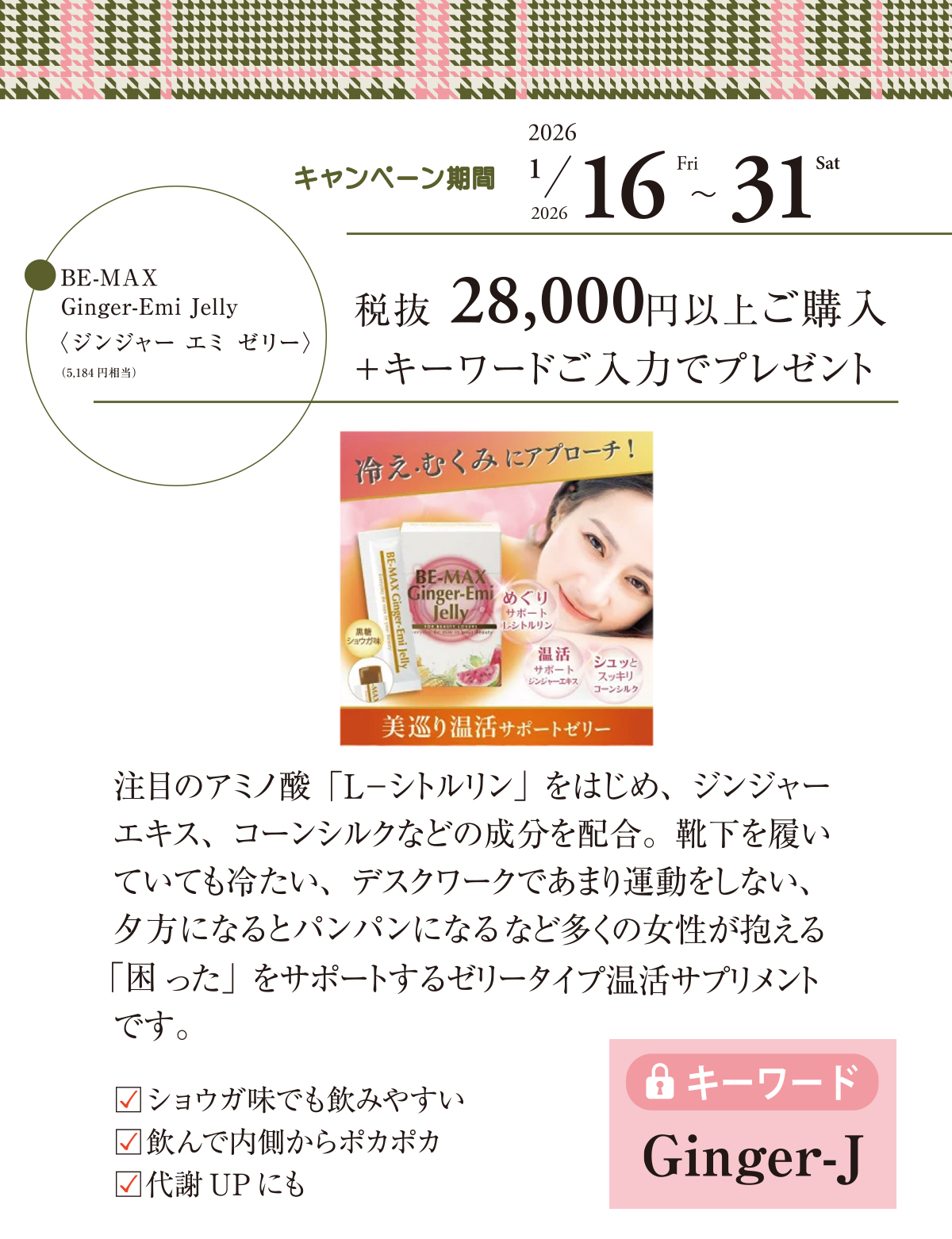 - 特典内容:注目のアミノ酸「L-シトルリン」をはじめ、ジンジャーエキス、コーンシルクなどの成分を配合。靴下を履いていても冷たい、デスクワークであまり運動しない、夕方になるとパンパンになるなど多くの女性が抱える「困った」をサポートするゼリータイプ温活サプリメントです。