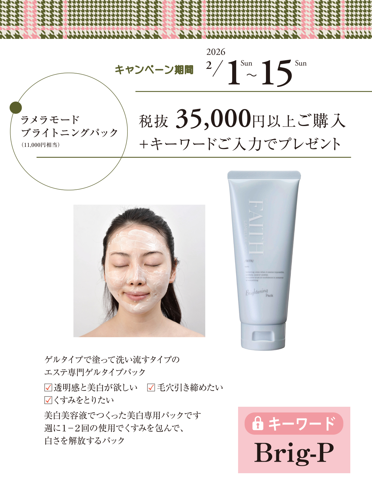 - 特典内容:ゲルタイプで塗って洗い流すタイプのエステ専門ゲルタイプパック 美白美容液でつくった美白専用パックです 週に1−2回の使用でくすみを包んで、白さを解放するパック