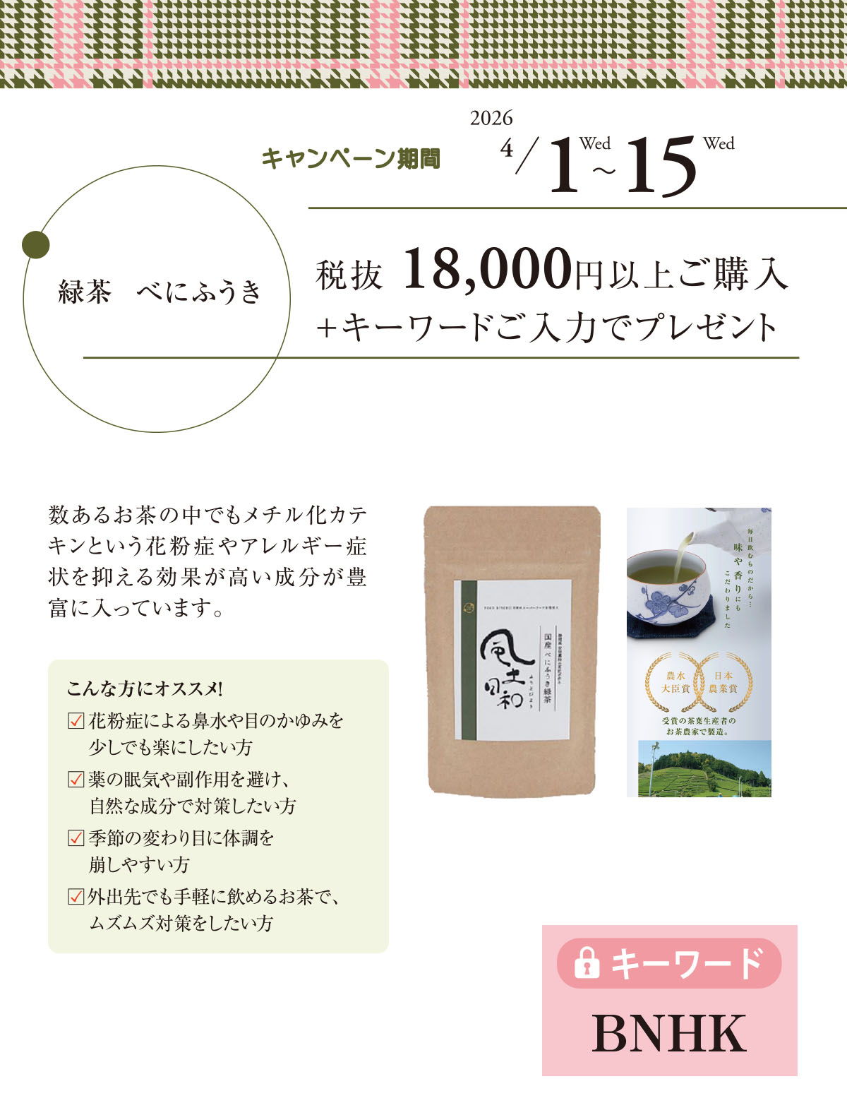 • 特典内容:数あるお茶の中でもメチル化カテキンという花粉症やアレルギー症状を抑える効果が高い成分が豊富に入っています。