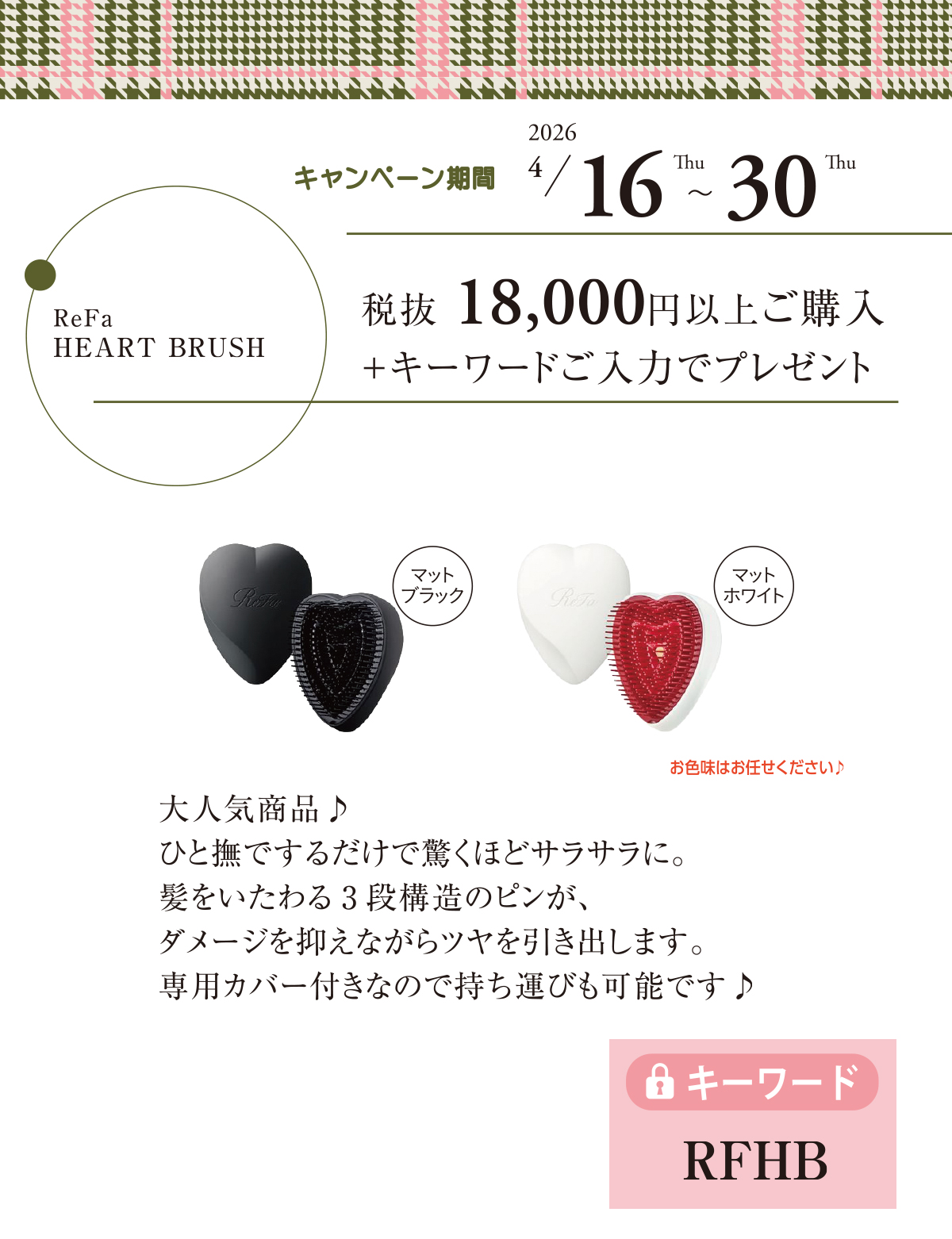 - 対象者:税抜18,000円以上ご購入+キーワードのご入力でプレゼント