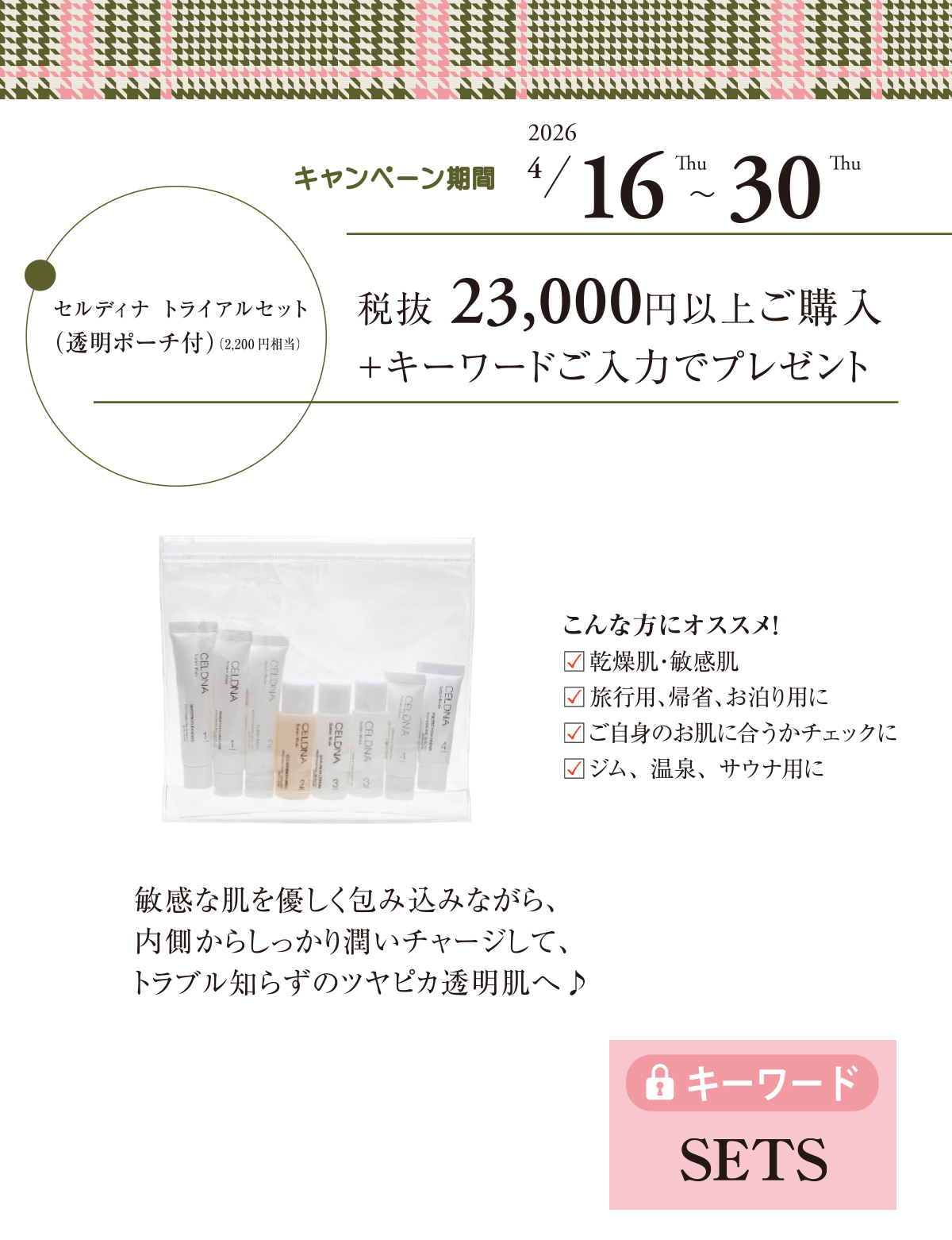 - 対象者:税抜23,000円以上ご購入+キーワードのご入力でプレゼント