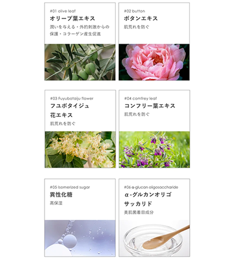 ※1.乳化剤不使用。クレンジング・洗顔料には一部洗浄剤として使用。ただし親水基、親油基とも石油起源の化合物から成る合成界面活性剤は不使用※2.ジメチコン類、シクロペンタシロキサン※3.カルボマー※4.パラベン、フェノキシエタノール、1,2-ヘキサンジオール